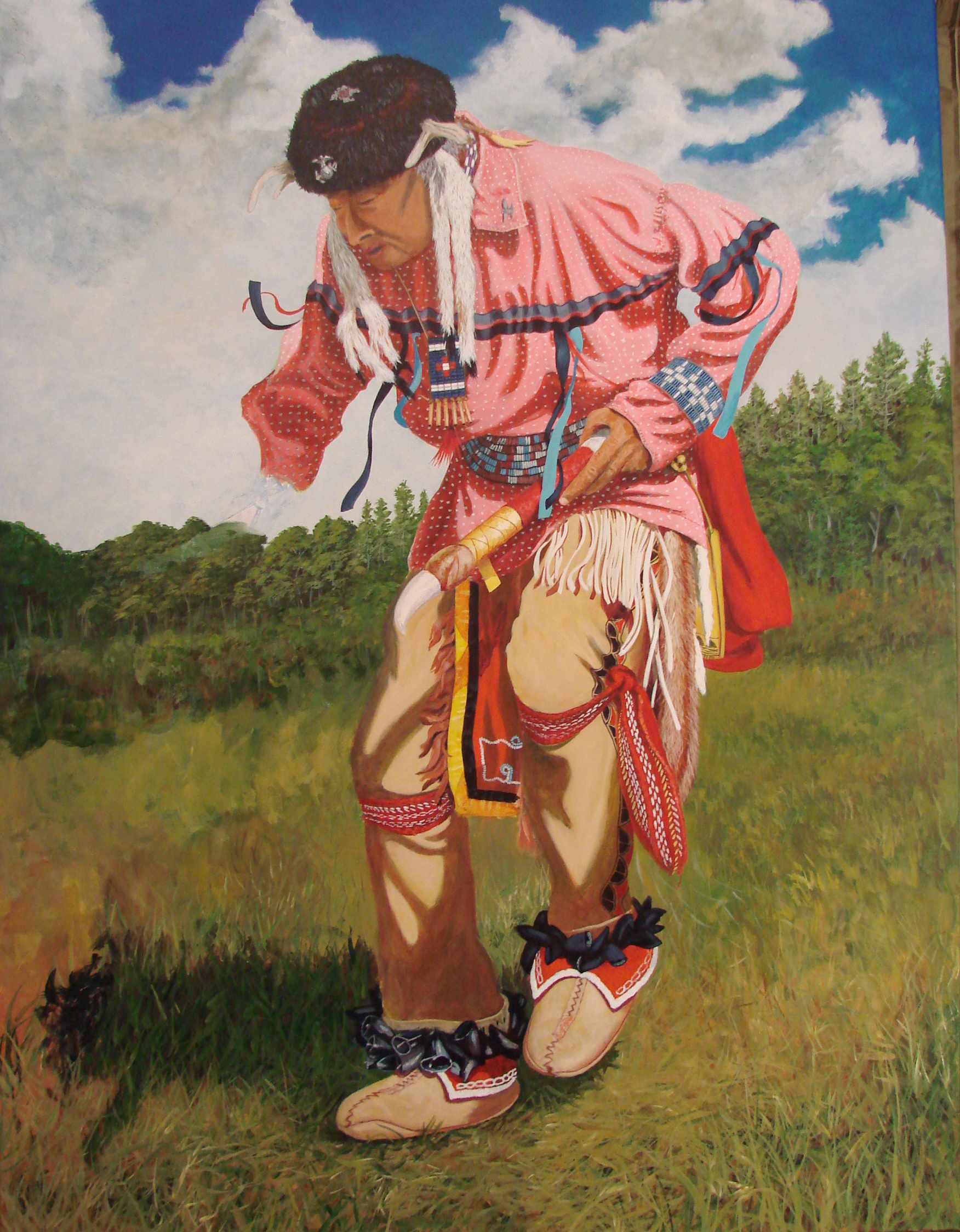 The painting is coming along well. I completed the shirt and one hand holding a coup stick. Also, the breach cloth, pants, some fringe and one knee sash is done. The background and grass is near complete. I just finished the moccasins and ankle bracelets.