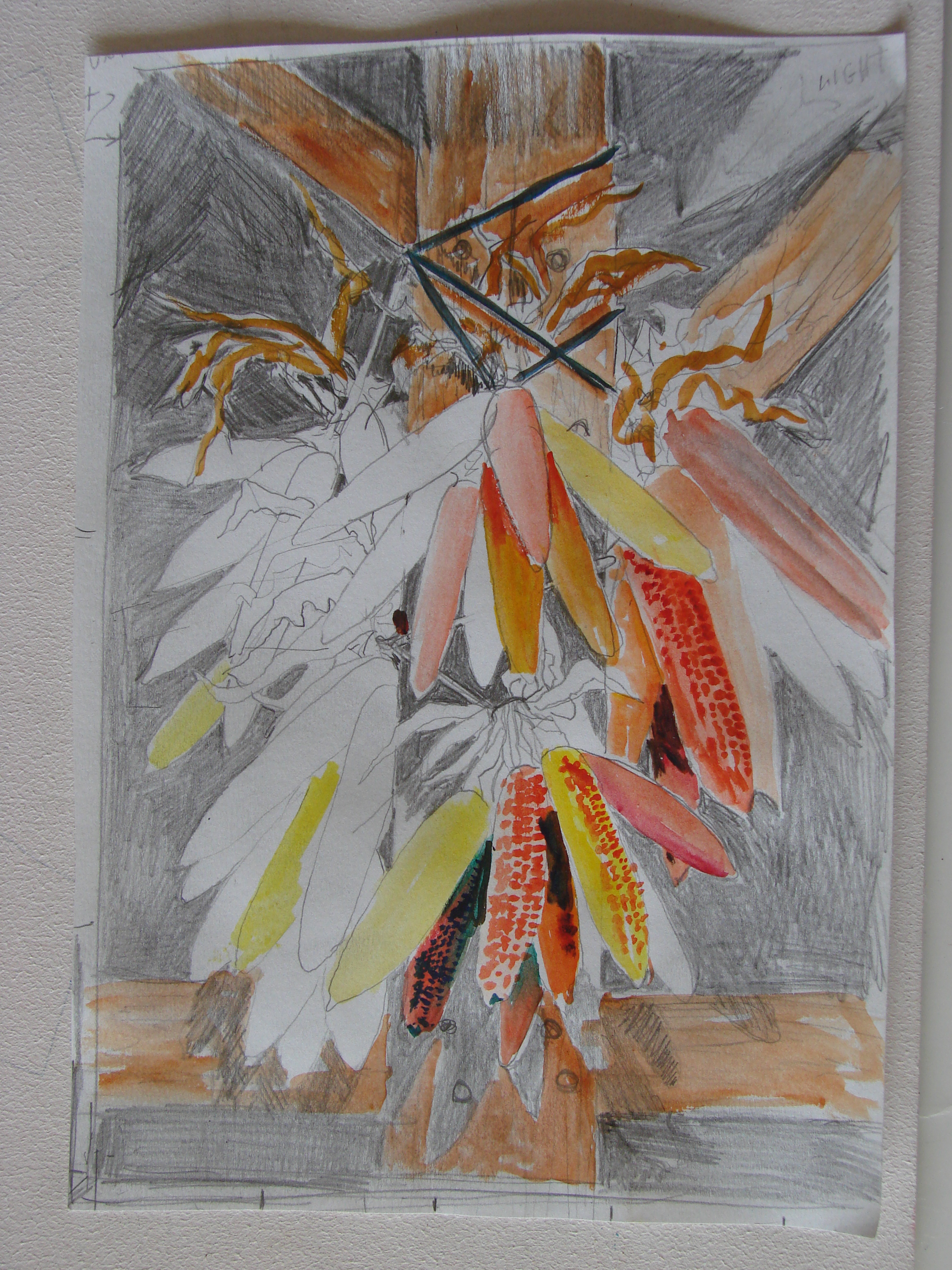 I enjoy painting multi-colored ears of Indian corn. The variety of colors they come in is amazing. I thought for some time how I might use these in a large format painting. I had a photo of white washed beams in an old barn at a local winery, and had worked out a way to incorporate these and the corn into a painting. The 6 X 8 inch pencil and water color sketch below was used as a starting point.