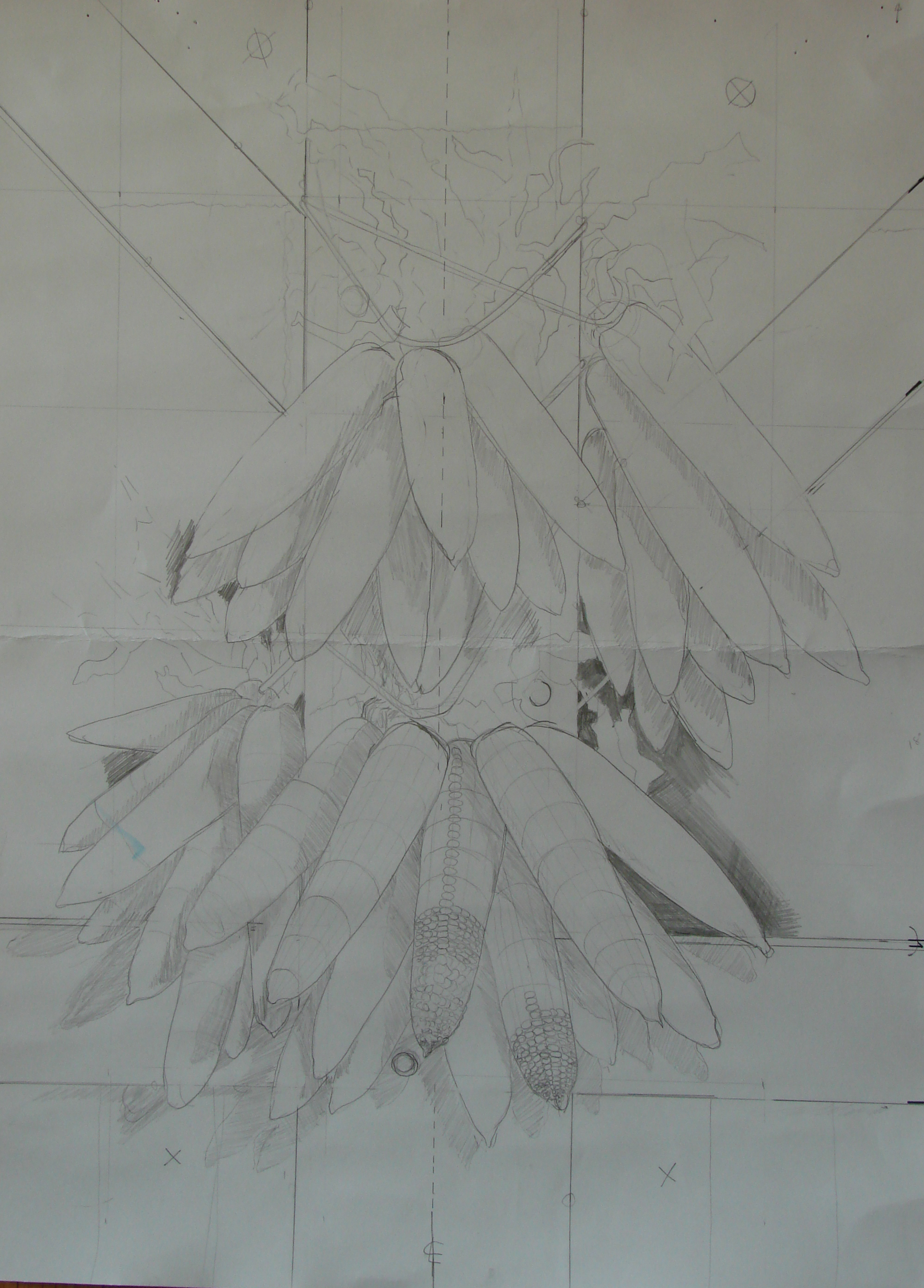 I followed this up with a full-size drawing laying out four groups of corn and husks tied to the post. I had an 18 X 32 inch gold frame on hand. I cut a sheet of 1/8th inch Masonite to an 18 X 32 inch panel. Using a three inch short-nap roller, I applied three coats of gesso to the face of the panel, letting each coat dry overnight. I sandpapered each coat lightly before applying the next coat. This produced a texture with thousands of tiny peaks and depressions that I prefer to paint on. I applied two coats of gesso to the back of the panel to reduce warping.