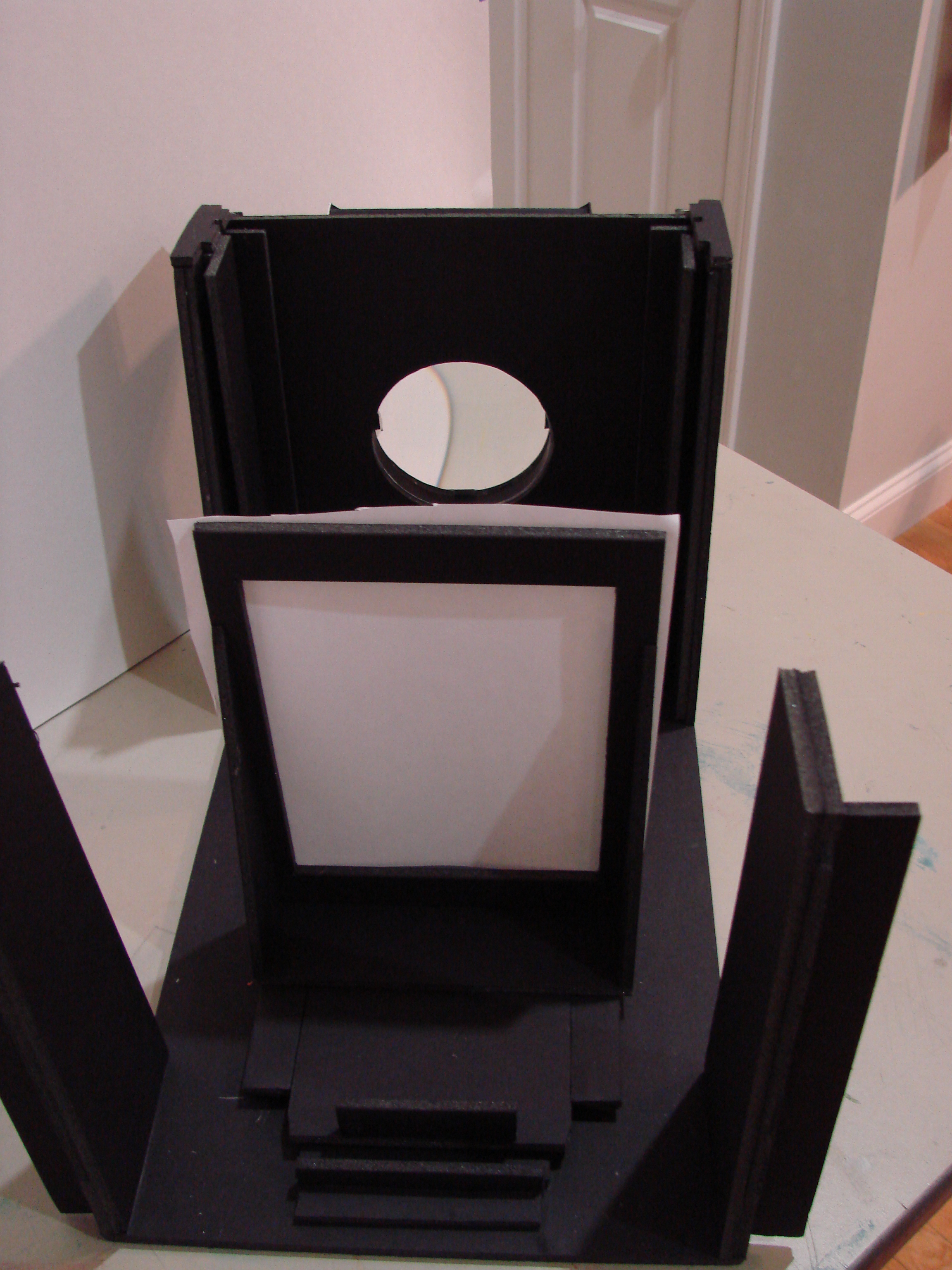 Photo 5. I cut a base of foam core 9 X 14 inches and built corner supports to hold the lens cell and back corners of the camera body. A second 8 X 8 inch piece with a 2 7/8 inch hole was placed between the front posts. The lens cell is slid into the slots and lines up with the hole in this piece. Bracing and corner supports were added as needed.