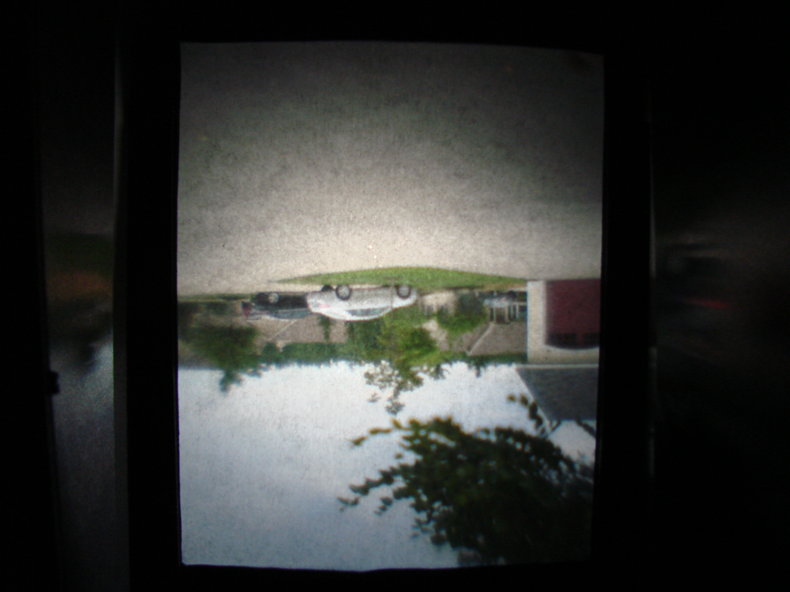 Photo 12. This photograph was taken with the digital camera looking through the back of the camera obscura (no mirror in place). The vertical sled had tracing paper inserted in the holder.  The image projected onto this is flipped upside down.