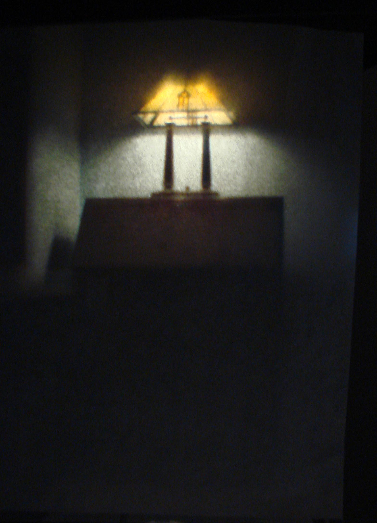 Photo 17. This is the lamp you see in the long shot toward the bedroom (photo 14).  This was taken through the tracing paper, mirror and lens.  The distance was approximately 12 feet.  Again, the image is flipped.  Note the cast shadows from the single lamp that was turned on.