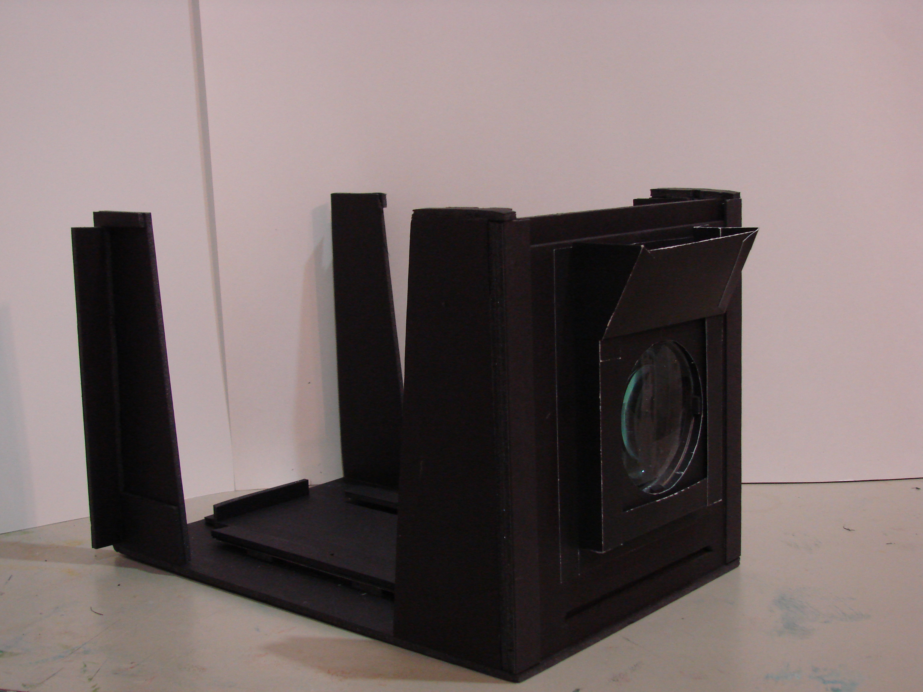 I started with black foam core, black card stock, Elmer’s glue, and a hot glue gun again. I used an old, glass three-inch diameter magnifying glass for the lens. I constructed the lens cell first, as this dictated the overall size of the body of the camera. The lens cell can be positioned in three vertical slots to help reach focus on the glass plate.