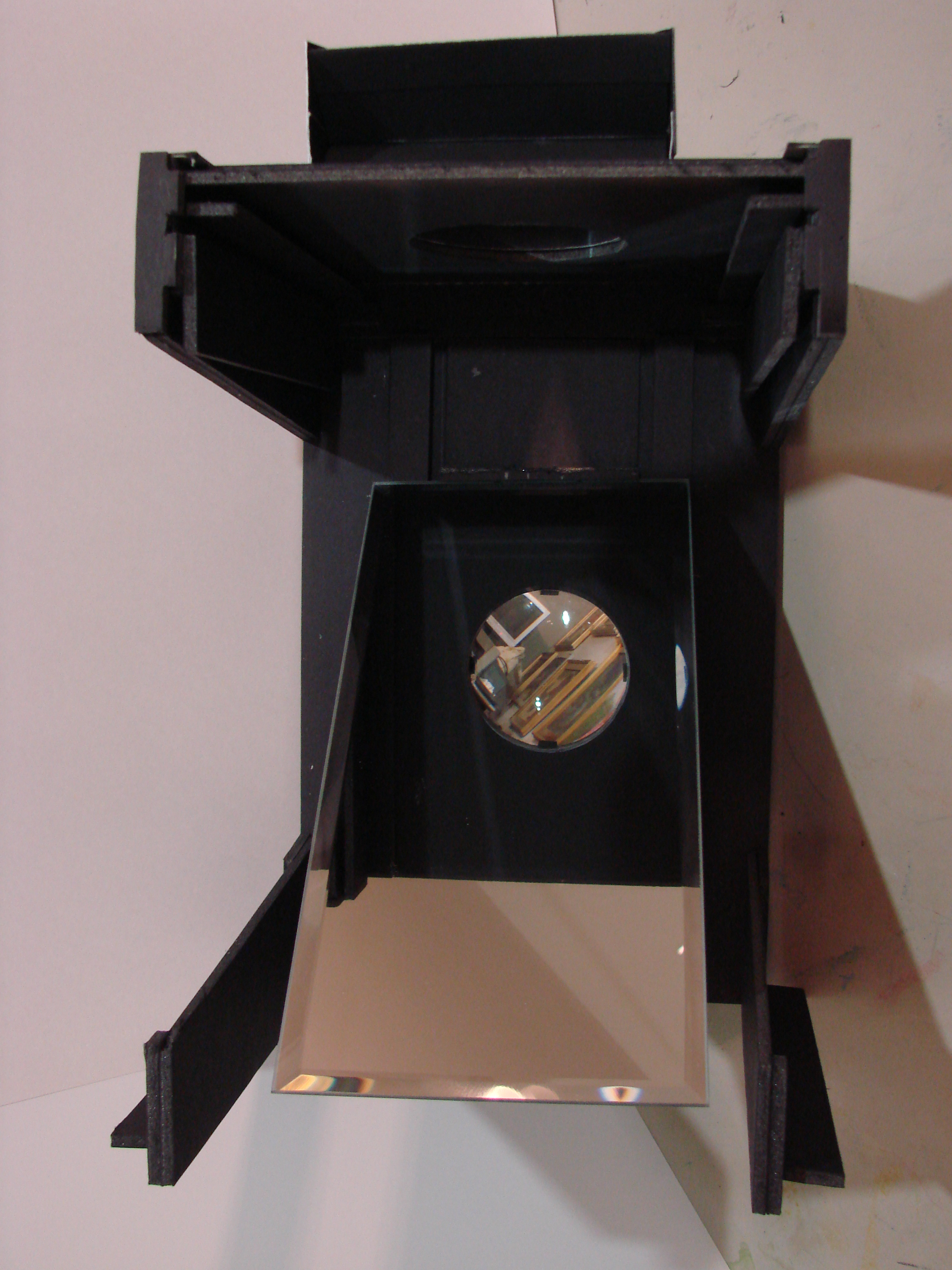 I used a cheap plastic magnifying glass for the lens and placed this at the end of a cardboard tube. White foam core was used for the body of the camera.  A 4″ X 6″ mirror was set at a forty-five degree angled wedge, and attached to the inside end of the outer box at the back of the camera. This reflected the image from the lens to a glass plate on the top of the outer box.