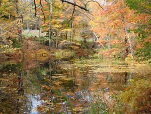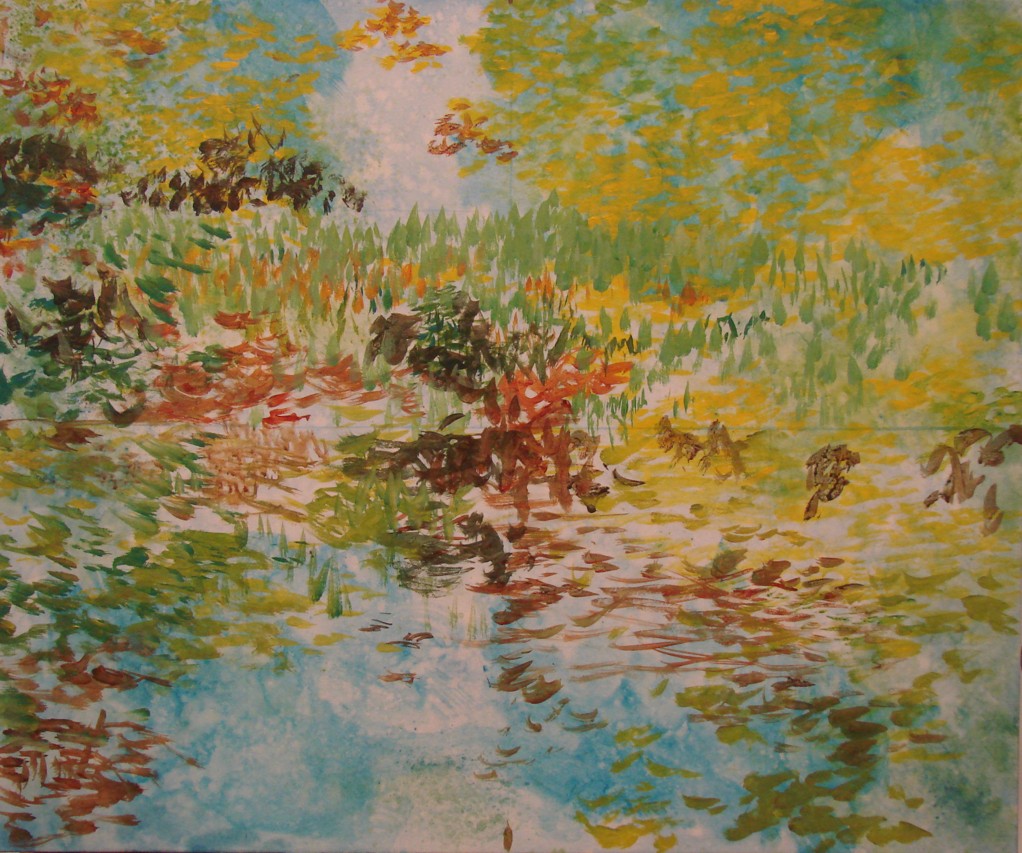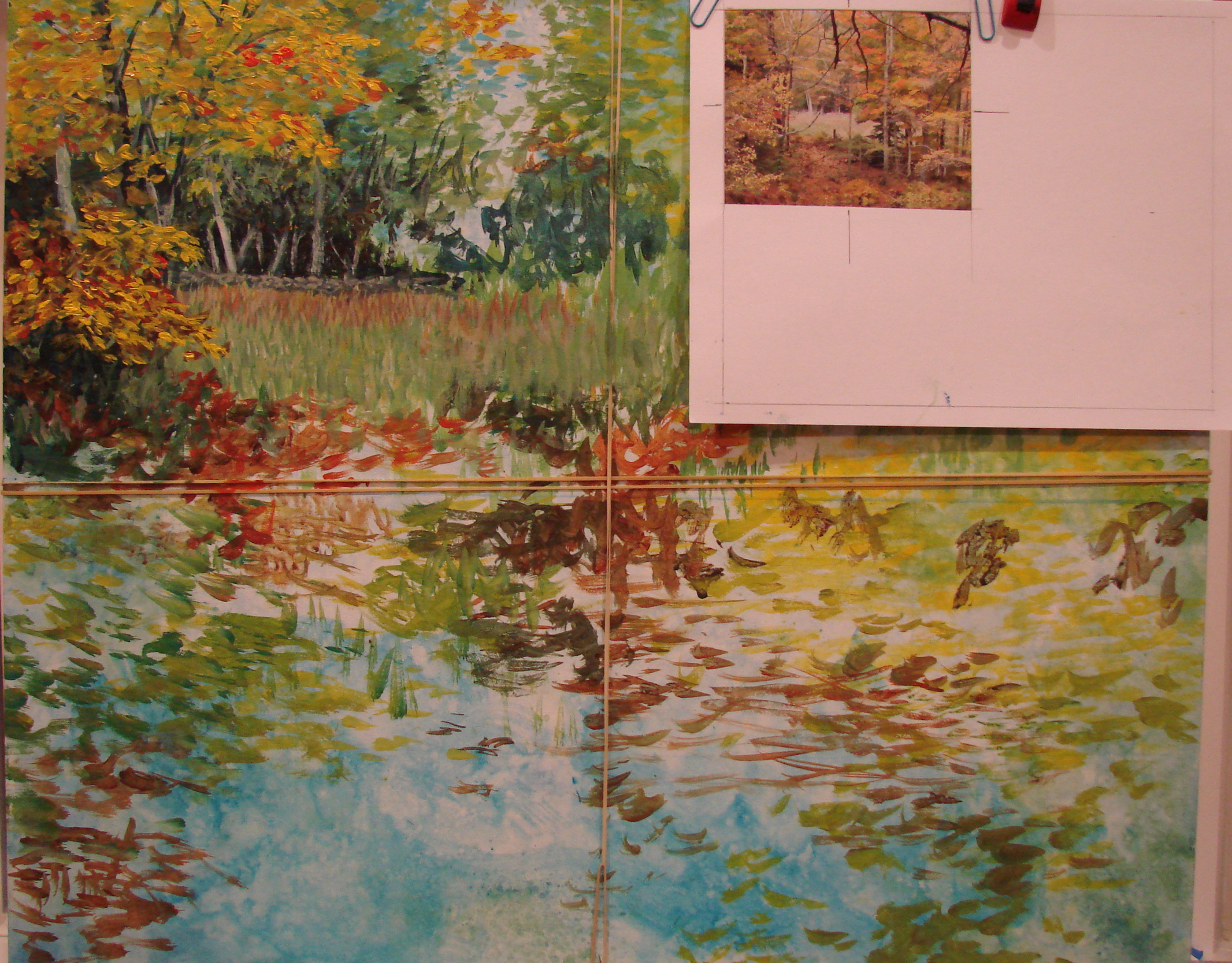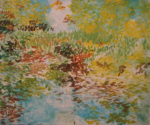 The past two Octobers, we have visited a scenic nursery in southern New Hampshire. A river flows through the site, and provides a nice spot for a fall foliage photo opportunity. This day, the wind was blowing and the multi-colored leaves and waters surface were shimmering with a riot of color. I took a dozen shots, and choose the photo below for the work. For this painting, I wanted to experiment with a loose and quickly done style that reflected the visual and atmospheric impression my eyes saw. I wanted to paint this scene quickly. I used very loose slashes, dabs and dabs of color on a very smooth, toned canvas.