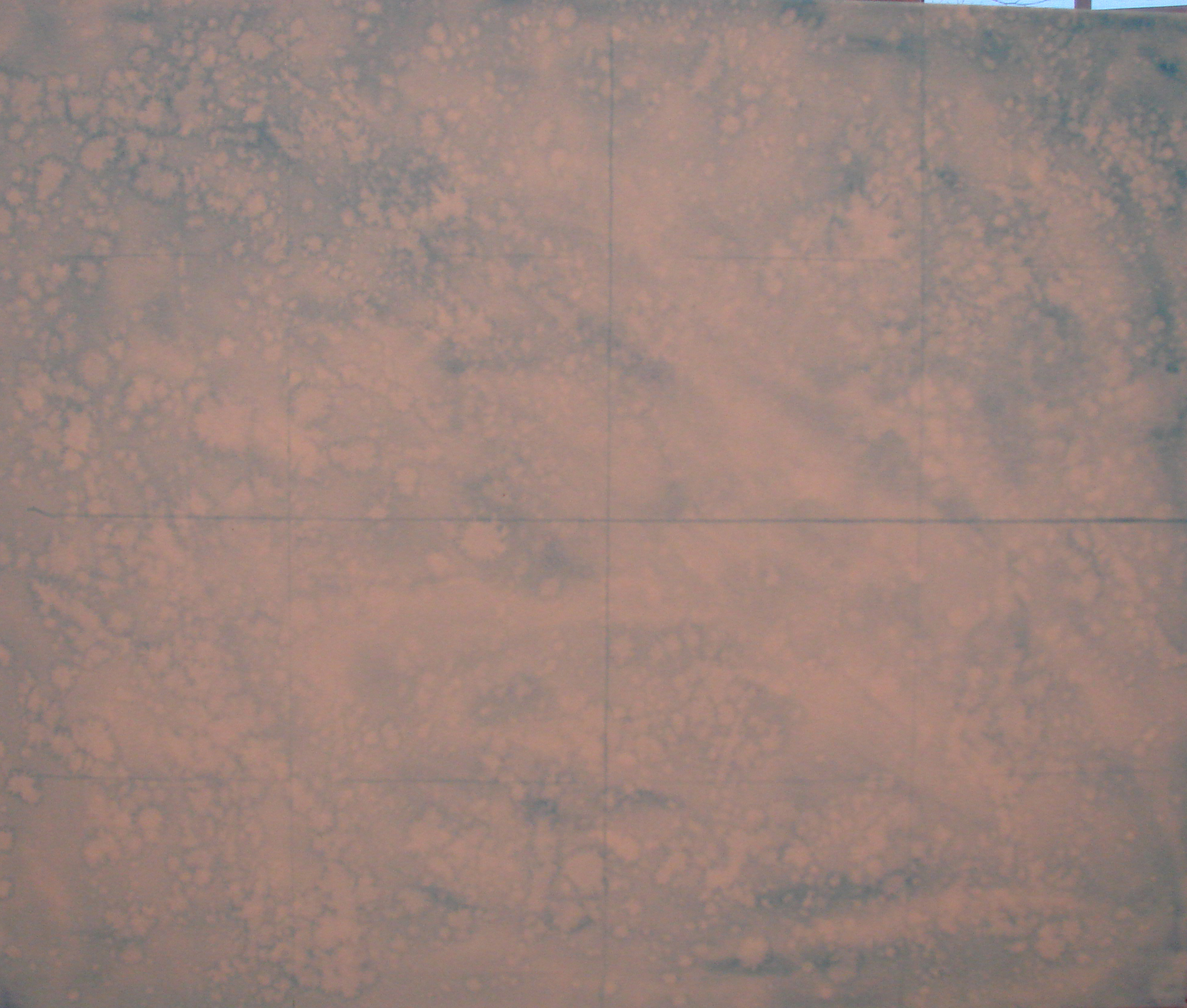 I prepared the surface using the steps under the tab on Surface Preparation. (Insert link to Masonite Panel Preparation). Using thinned cerulean blue, I drew two light blue lines on the 24 X 20 canvas, dividing it into fourths.