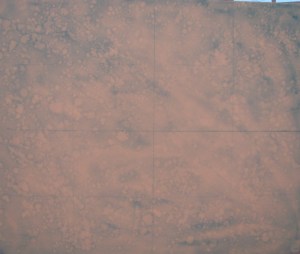 Before the surface dried too much, I set the nozzle of the eight ounce spray bottle for a coarse, slightly drippy spray. I then held it high above the canvas and sprayed it so full drops of water and misty water fell on the surface. In some areas, I dipped my fingers in a jar of (soapy) water and flicked larger drops on with my finger tips. These drops of soapy water cause the paint to migrate to the edges of the droplets. This makes an interesting pattern as shown in the photo below.