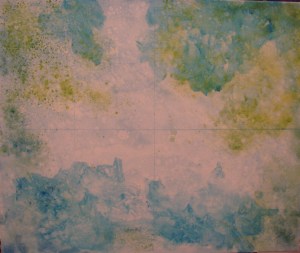 I toned the surface by laying the canvas flat on the work table and wetting it thoroughly with a fine mist. I used a two ounce spray bottle of water with a few drops of dishwashing detergent in it (insert link to tabs for tools and methods). I want to cover the whole surface with a thin layer of standing water. I quickly applied a thin wash of cerulean blue, and a touch of cobalt blue in a random wash using plenty of water. I want to float the wash over the whole surface in an uneven layer of paint. I let this dry a minute or so, but I didn’t let it dry thoroughly. I used the hair drier to help dry the surface and evaporate some of the larger puddles of water. I also dabbed off large puddles of water with a crumpled rag.