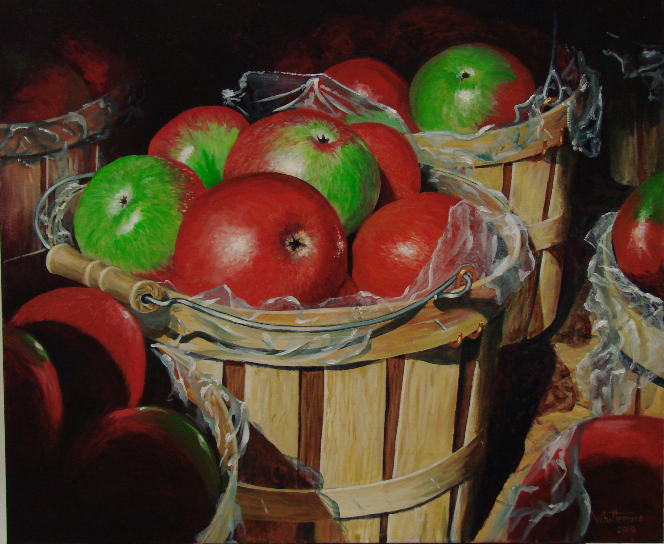 We visited a local apple orchard and I took a bunch of photos of the produce for sale. There was a dormer in the roof of the barn and a single shaft of sunlight was hitting a group of baskets of apples on a table. The photo had strong sunlight on the apples and deep shadows around the edges and this framed the baskets of apples perfectly.