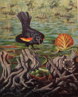 I photographed this Red-wing Blackbird while kayaking on the Pow-wow River in Kingston NH. He was perched on a tree stump along a mud bank and was singing and flashing the red and yellow chevrons on his wings.