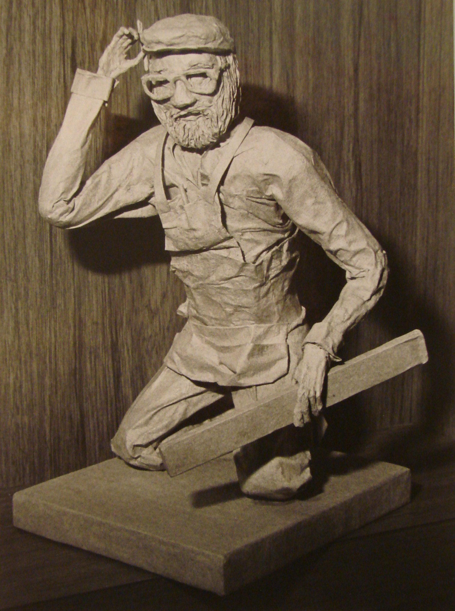 I created ten paper-mâché sculptures in the mid-1980s. I began with a copper wire armature on a wood base, and bent this into an approximate shape of the figure. The wire is usually double or triple lengths twisted to make the main wire stiffer. I used (tan) industrial tri-folded paper towels. I rolled them up tightly, and attached them to the armature with regular masking tape (not the blue painter’s tape). I fleshed out the figure to the desired final shape with these, and covered the whole thing with a layer of masking tape.