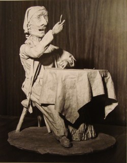 Heads were roughed in with tightly compressed dry towels and tape, and the overall features were fashioned by pressing in on the towels with a dull stick or other tool. The head was covered with finer strips of the wet towels. Facial details were formed with twisted and shaped pieces of wet towels and tweezers. Fingers were formed with small, twisted and dried pieces of towel. These were wound with thin strips of wet towels, and covered with very small pieces of towel torn and applied with tweezers. When the fingers were thoroughly dried, I bent them into their final shape, and covered the resulting cracks at the joints with more very small pieces of wet towels.